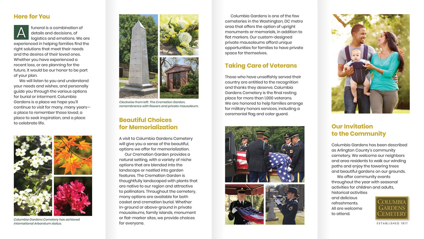 This campaign reintroduced Columbia Gardens Cemetery to the surrounding community. Brochures, sales materials, print ads, holiday cards, and a new website were all designed to promote the cemetery's 100th Anniversary.