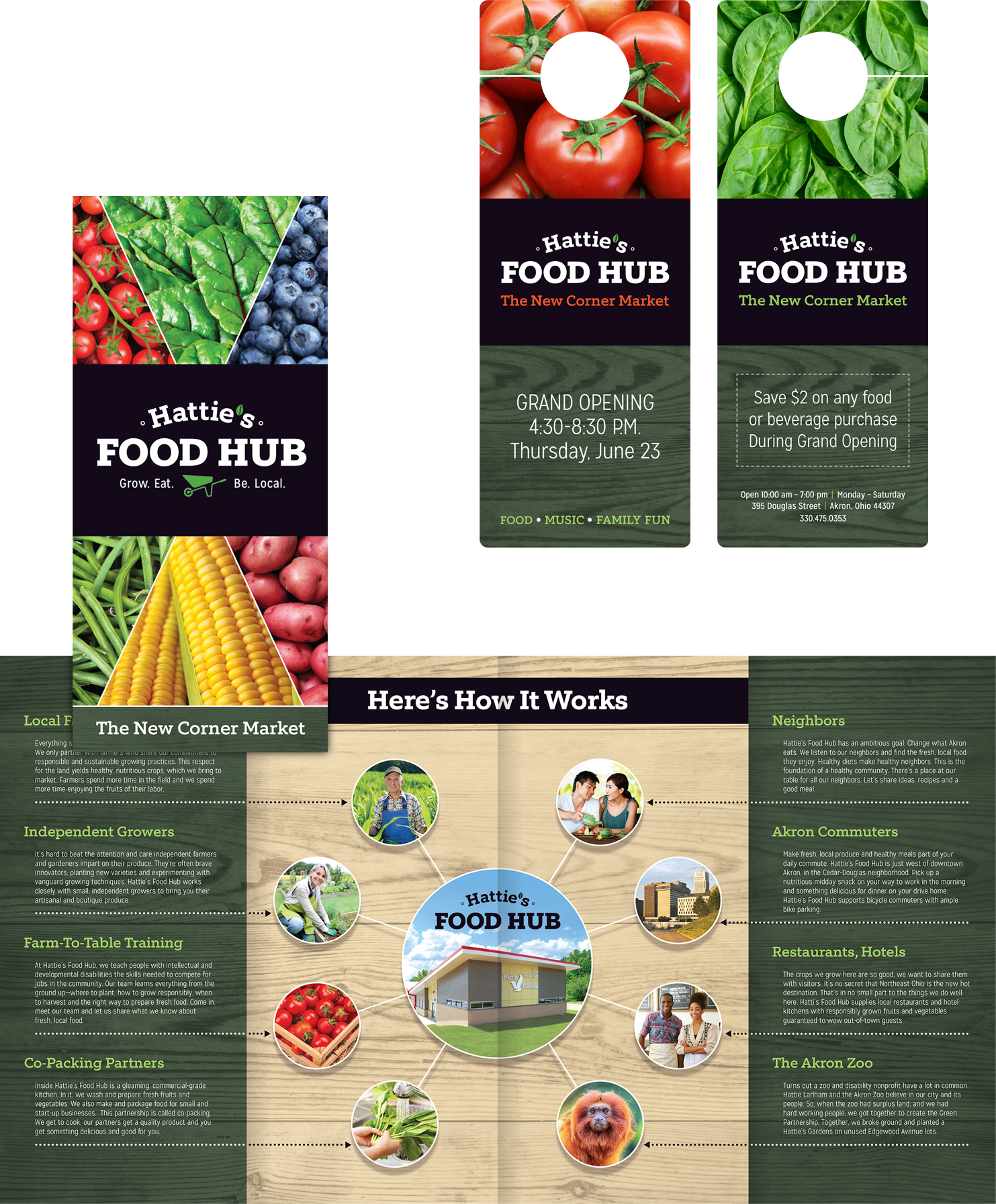 Marketing materials for the Grand Opening of an organic food market. Campaign included a postcard for local food growers, neighborhood door hangers, an all-audience brochure, and packaging for kids’ snacks.